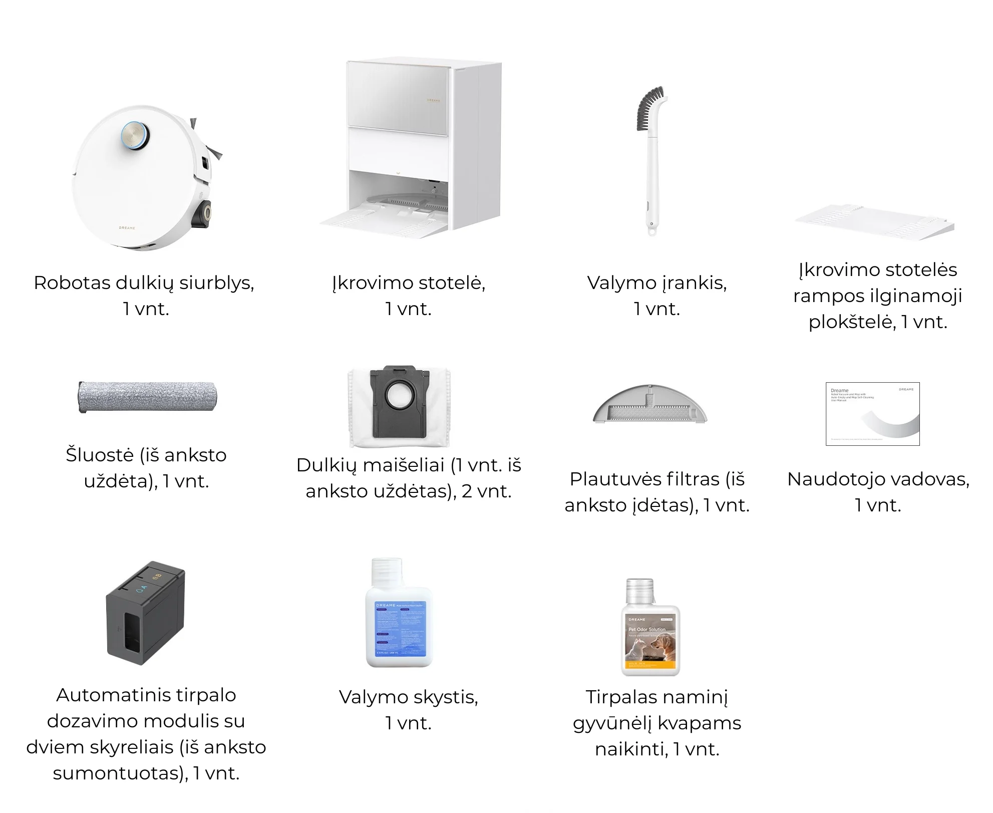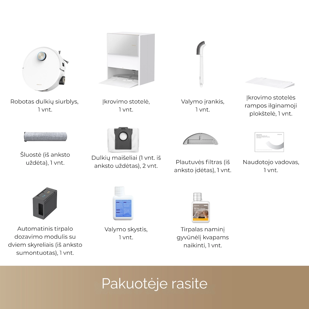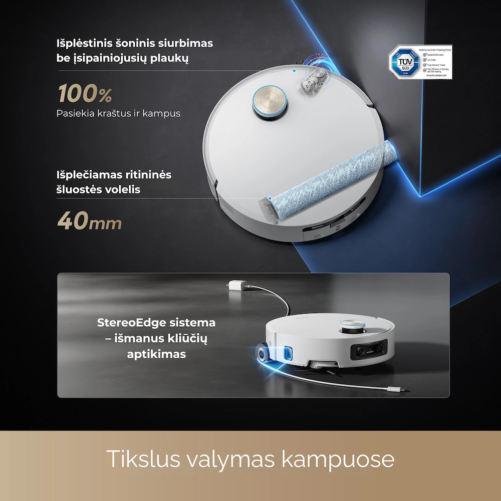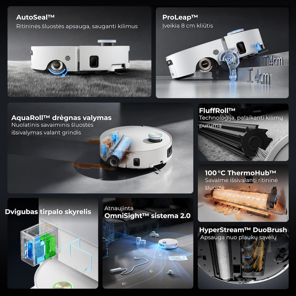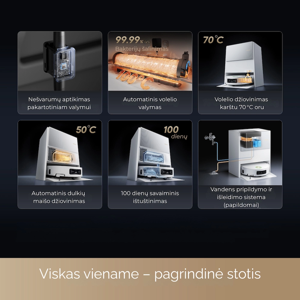 - Visapusiška priežiūros stotelė: automatinis dulkių ištuštinimas, vandens papildymas, ploviklio dozavimas ir šluosčių džiovinimas karštu oru.