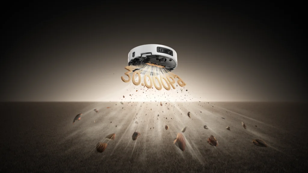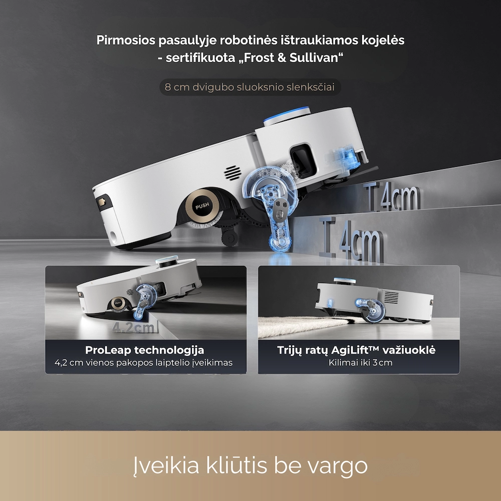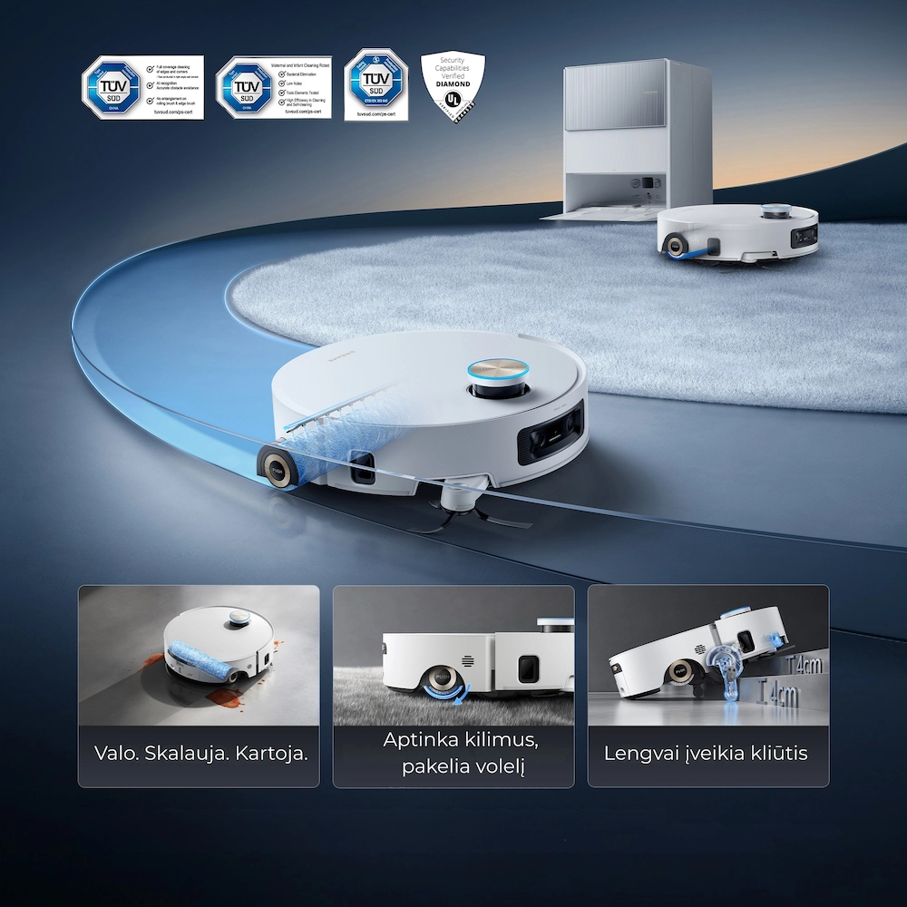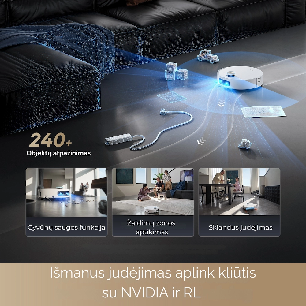 - Išmanus kliūčių atpažinimas: AI Action + 3D struktūrizuota šviesa leidžia robotui atpažinti ir apvažiuoti daugiau nei 80 tipų objektų net ir visiškoje tamsoje.