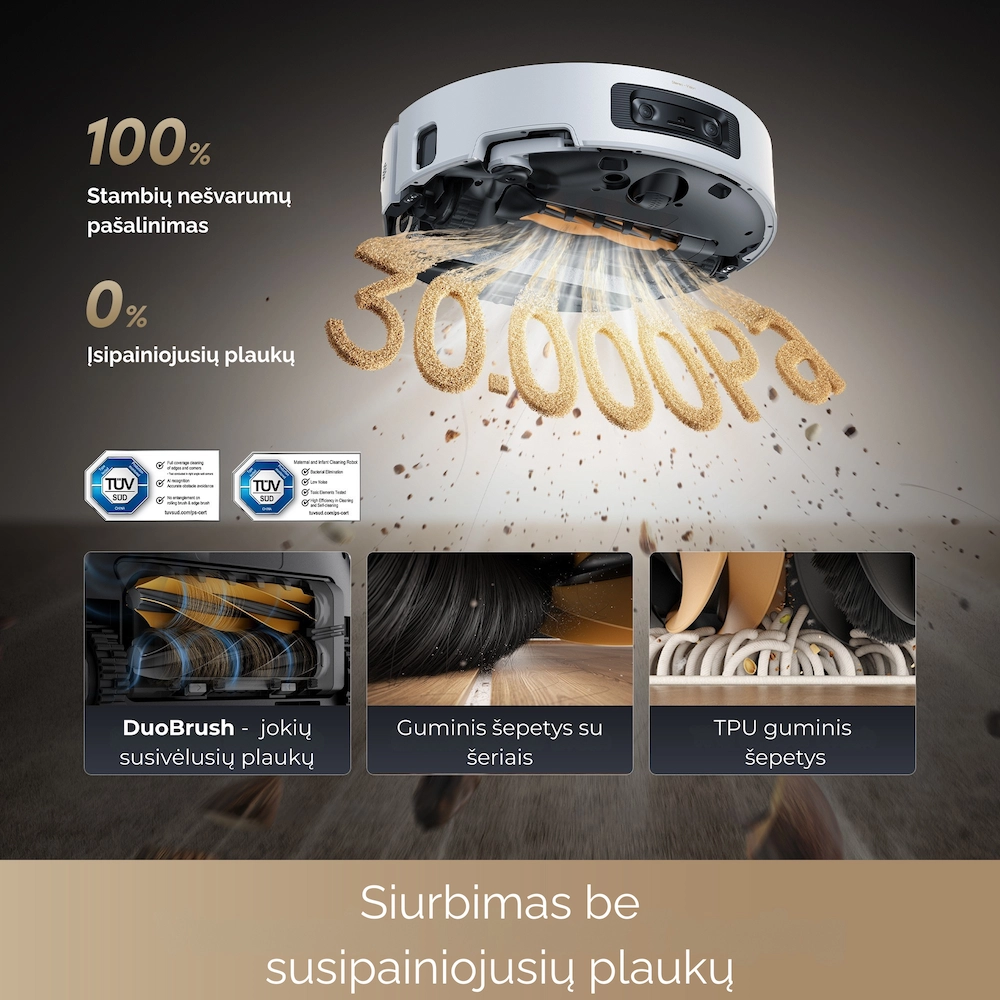 Užtikrina 100 % dulkių surinkimą, 99 % plaukų pašalinimą ir 50 % didesnį siurbimo efektyvumą, valydama įvairias grindų dangas; dvigubi ritininiai šepetėliai neleidžia plaukams įsipainioti, todėl rankinis valymas nereikalingas.