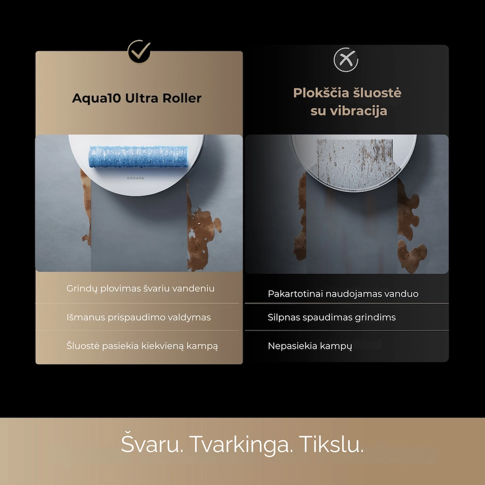 Skirtingai nei senos šluostės, kurios tik paskleidžia purvą, „AquaRoll“ technologija nuolat skalauja ritinines šluostes valymo metu, palaikydama jas švarias ir gaivias realiu laiku, valydama galingiau ir neleidžiant kauptis kvapams.