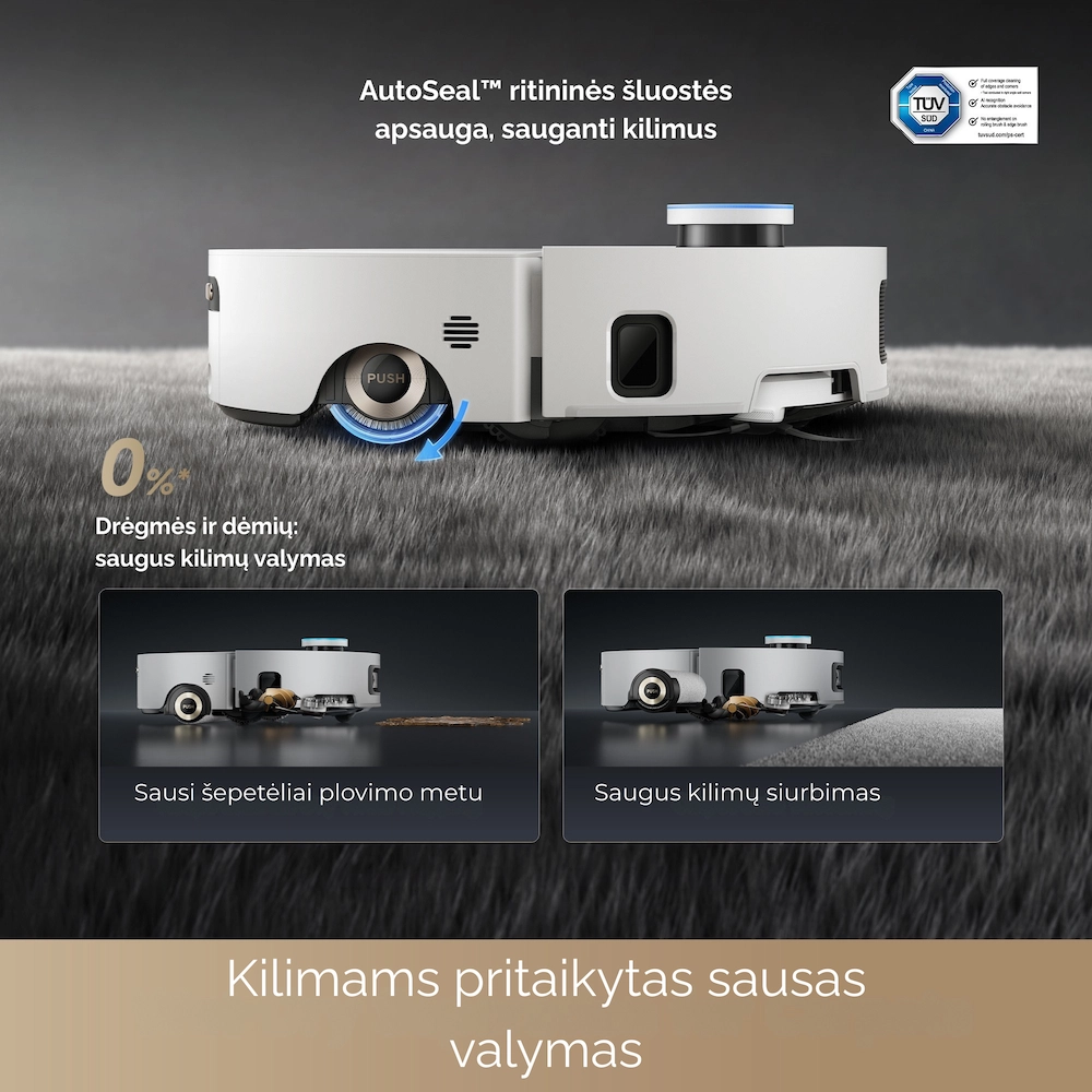 AutoSeal ritininės šluostės apsauga – tai DREAME išmanioji technologija, kuri rūpinasi kilimais, automatiškai užsandarindama ritininę šluostę, kai aptinka kiliminę dangą. Ši funkcija užkerta kelią drėgmės ir nemalonių kvapų kaupimuisi kilimuose.