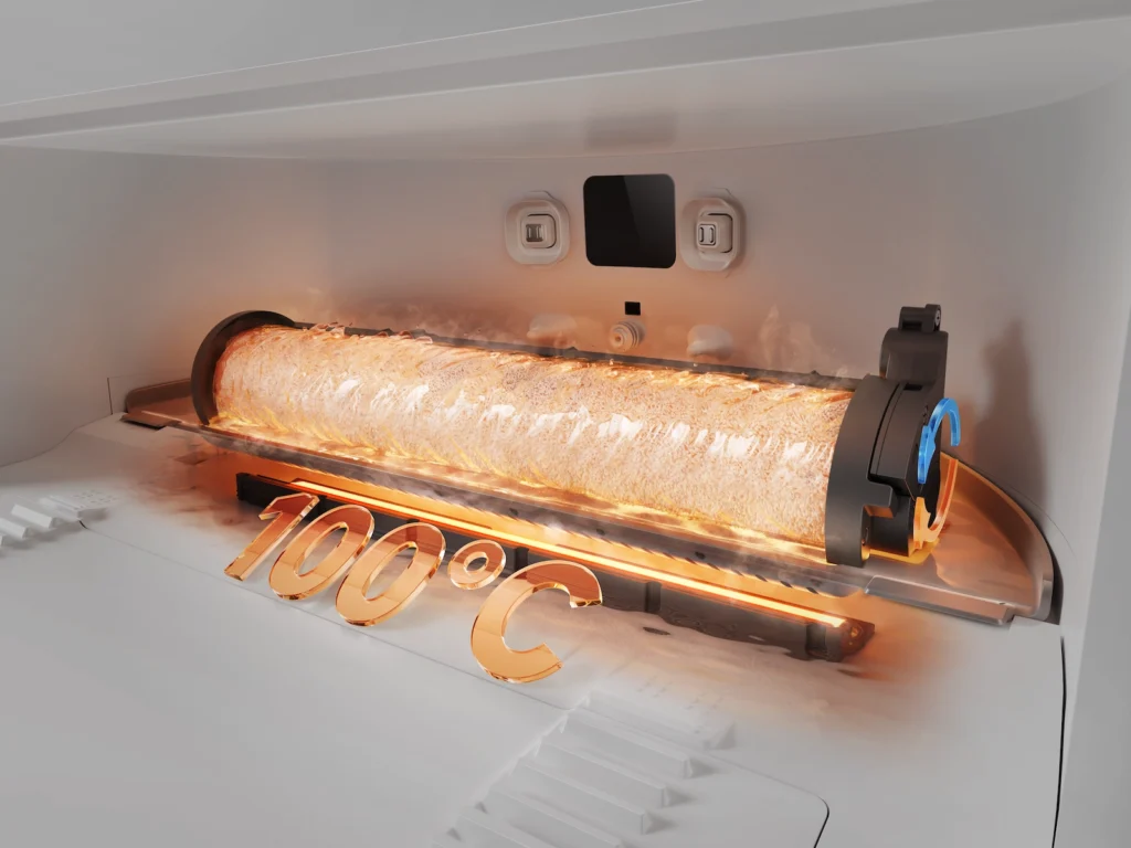 - Karšto vandens savaiminis išsivalymas: 60°C temperatūros vandens srautas ištirpdo riebalus ir nešvarumus nuo ritinėlio, užtikrindamas maksimalią higieną.