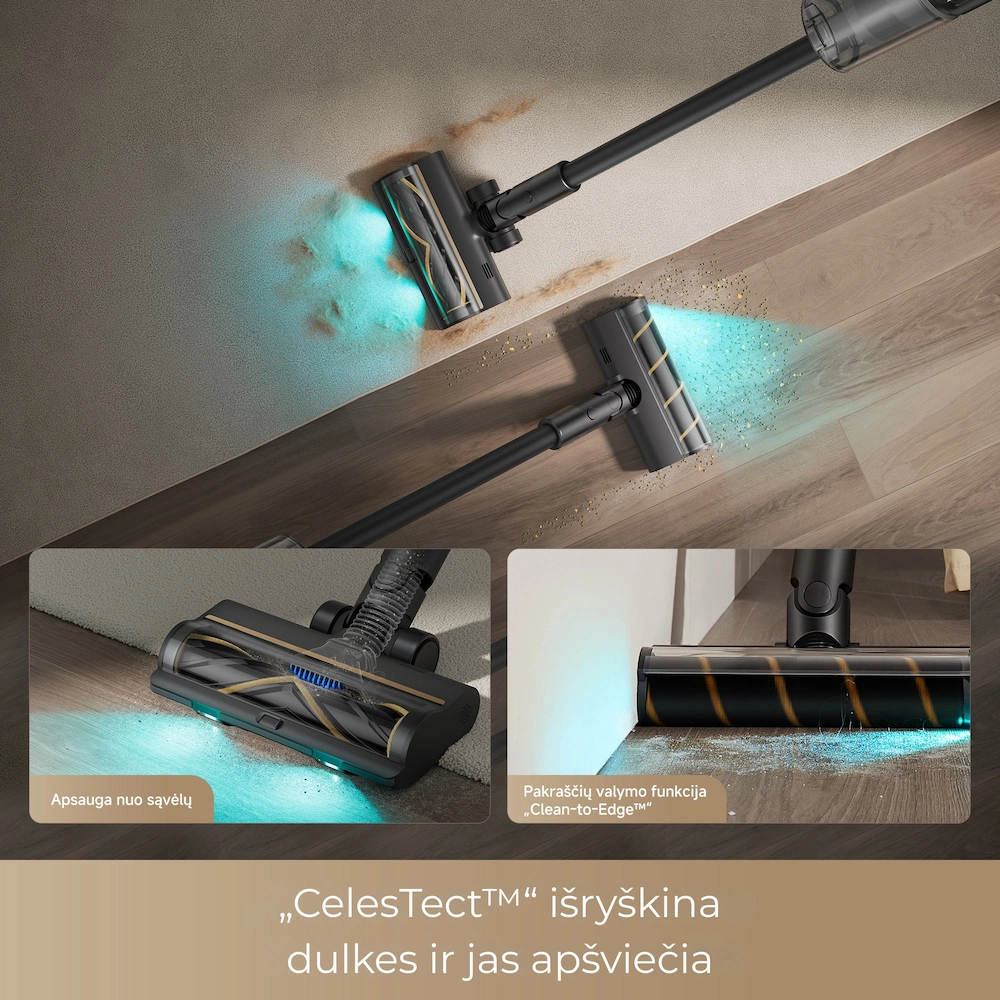 - CelesTect™ apšvietimas: dviejų spektrų (mėlynos ir žalios) LED šviesa atskleidžia net mažiausias mikrodulkes ant kietų grindų.