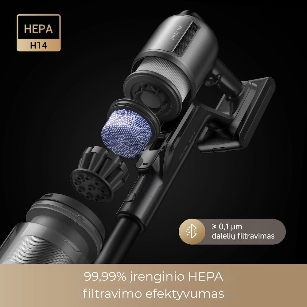 - HEPA H14 filtravimas: sulaiko 99,99 % virusų, bakterijų ir alergenų (iki 0,1 μm), užtikrindamas higieną valymo metu.