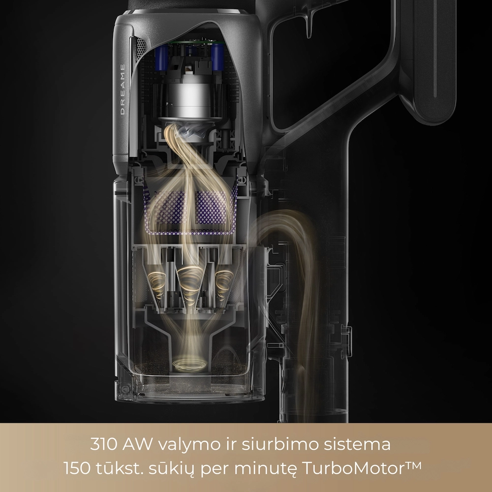 - Rinkos lyderio galia: net 310 AW siurbimo galia ir 150 000 aps./min „TurboSpin“ variklis – galingiausias Dreame serijos siurbimas.