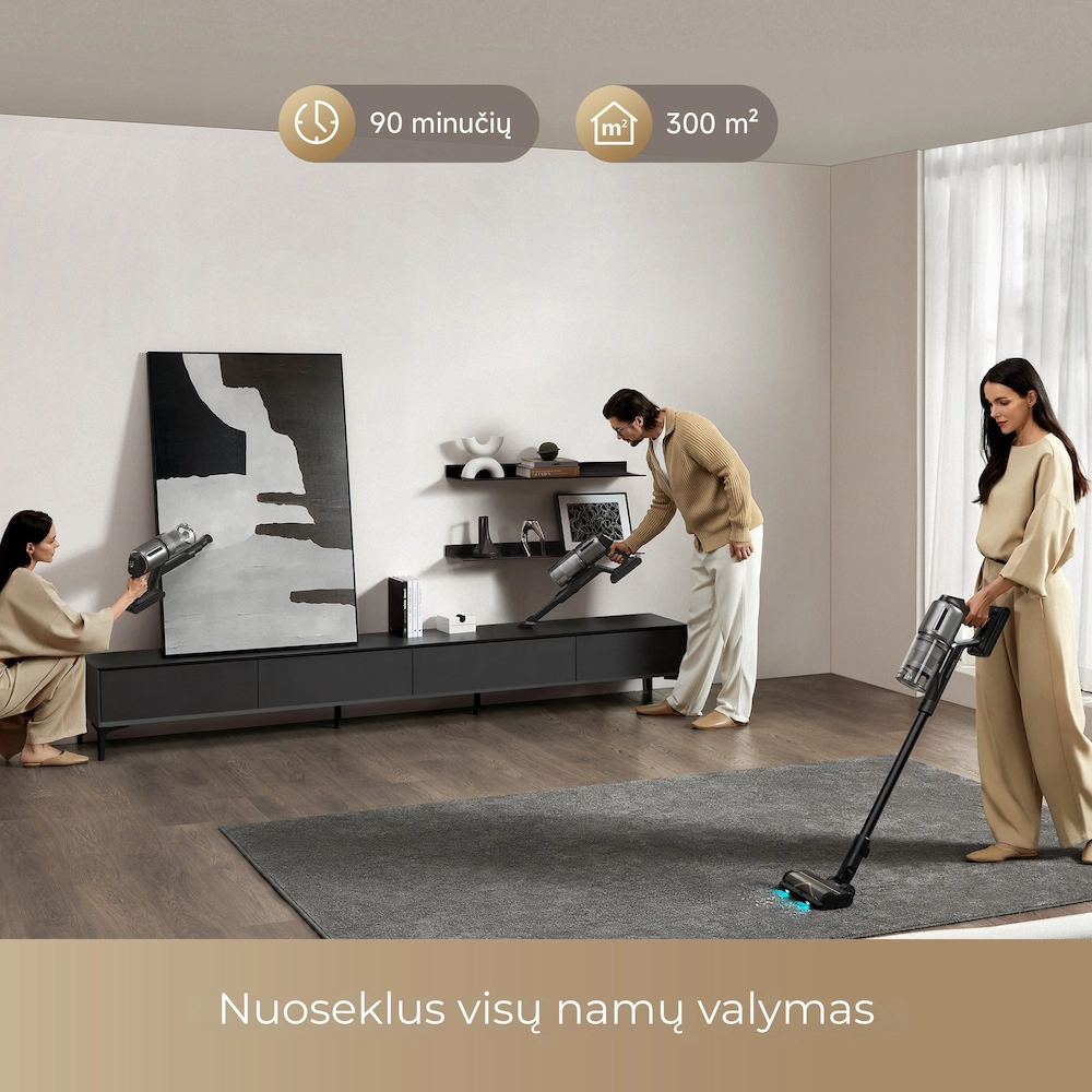 - 90 min. veikimo laikas: galinga baterija leidžia išvalyti didelius namus viena įkrova (sauso siurbimo režimu).
