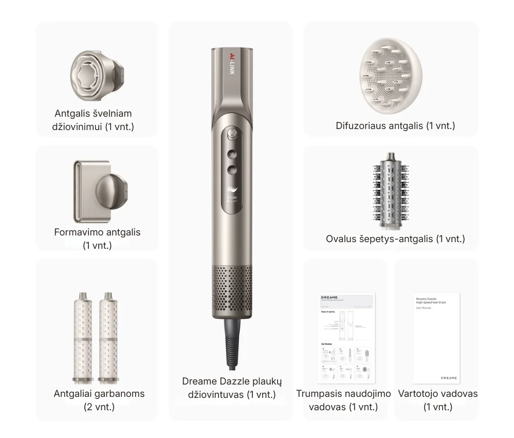 - 6-in-1 formavimo rinkinys: komplekte yra lyginamasis ir formavimo antgaliai, difuzorius, ovalus apimties šepetys bei du (kairinis ir dešininis) garbanojimo antgaliai įvairioms šukuosenoms.
