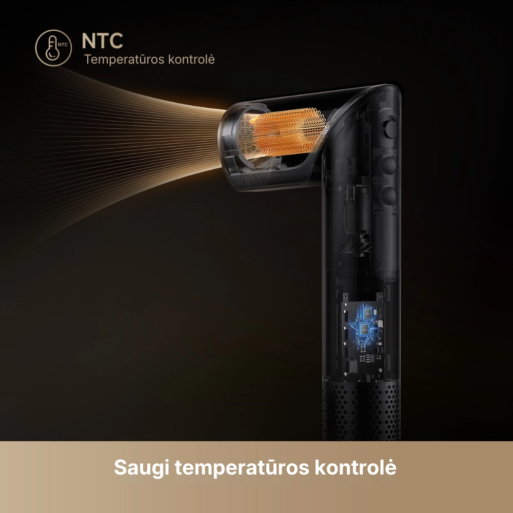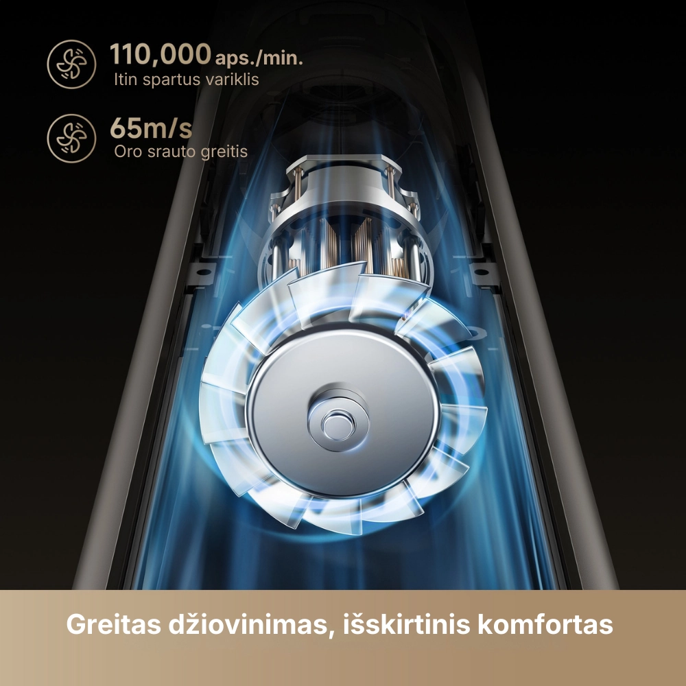 - Aukšto greičio bešepetėlis variklis: 110 000 aps./min. greitis sukuria galingą oro srautą, leidžiantį išdžiovinti plaukus vos per kelias minutes.