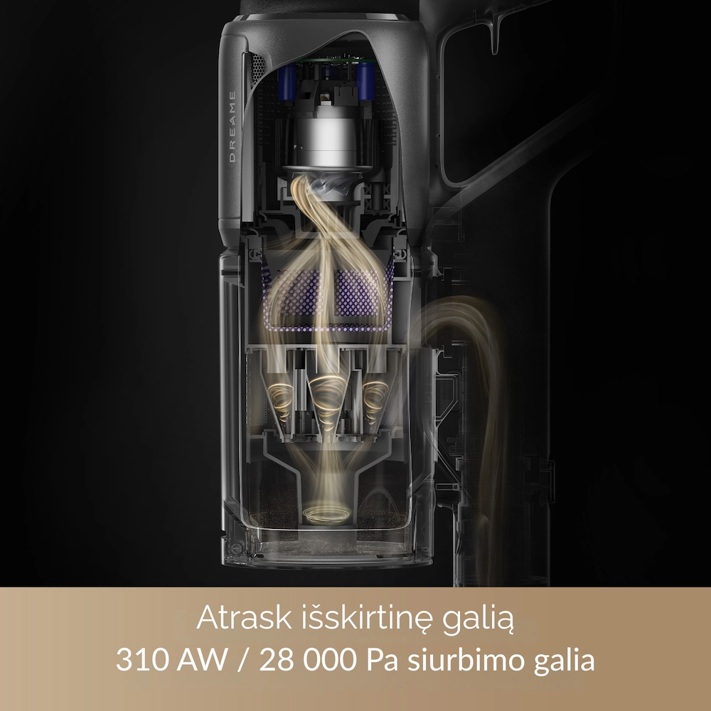 - Rinkos lyderio galia: net 310 AW siurbimo galia ir 150 000 aps./min „TurboSpin“ variklis – galingiausias Dreame serijos siurbimas.