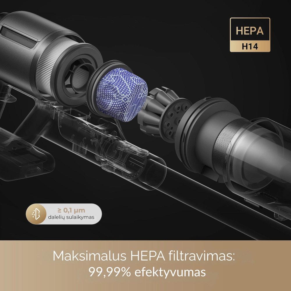 - HEPA H14 filtravimas: sulaiko 99,99 % virusų, bakterijų ir alergenų (iki 0,1 μm), užtikrindamas higieną valymo metu.