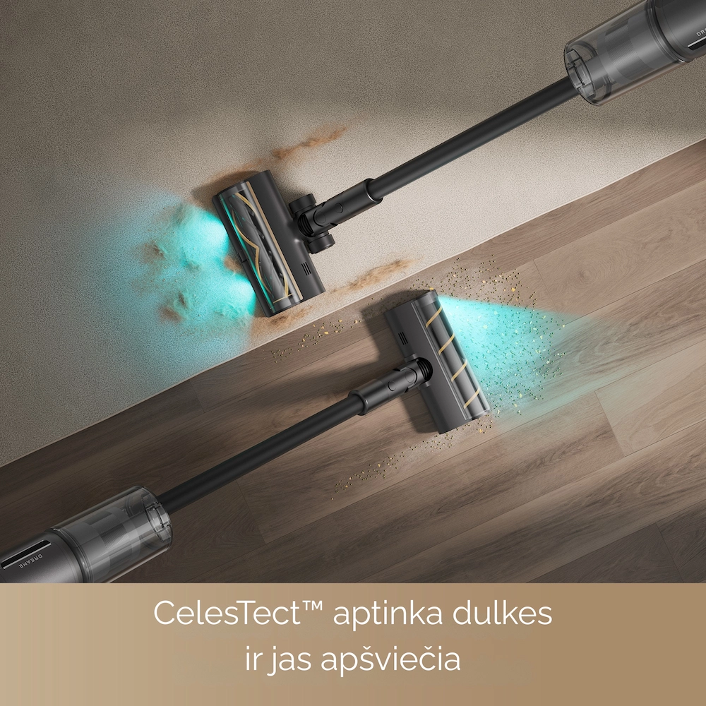 - CelesTect™ apšvietimas: dviejų spektrų (mėlynos ir žalios) LED šviesa atskleidžia net mažiausias mikrodulkes ant kietų grindų.