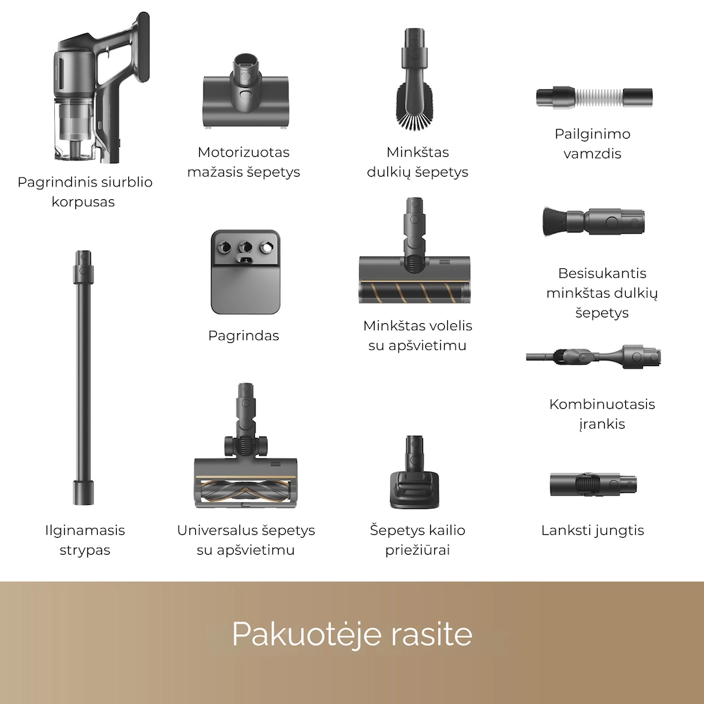- Mini šepetys baldams: švelniai ir efektyviai surenka dulkes bei gyvūnų plaukus, su antivėlimosi dizainu.