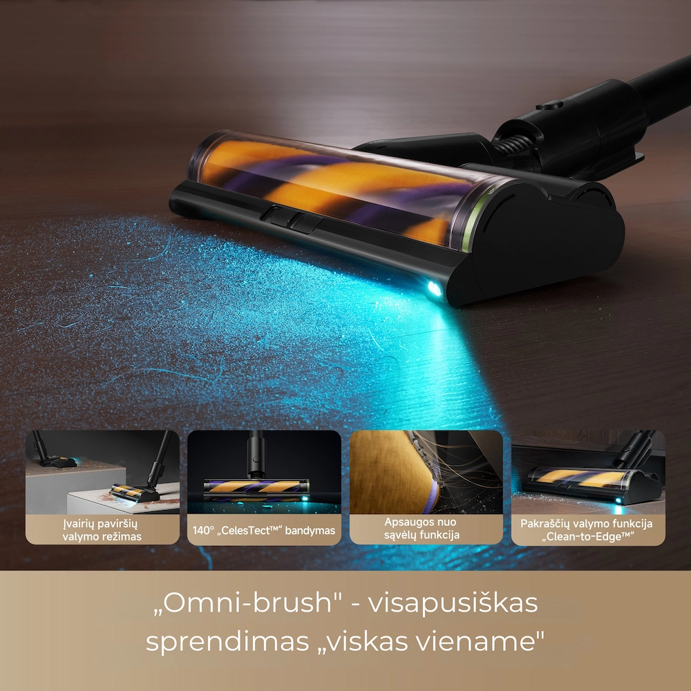 - Omni-Brush™ sistema: šepetys su „CelesTect™“ 140° kampo apšvietimu atskleidžia paslėptas dulkes daug plačiau nei įprasti modeliai.