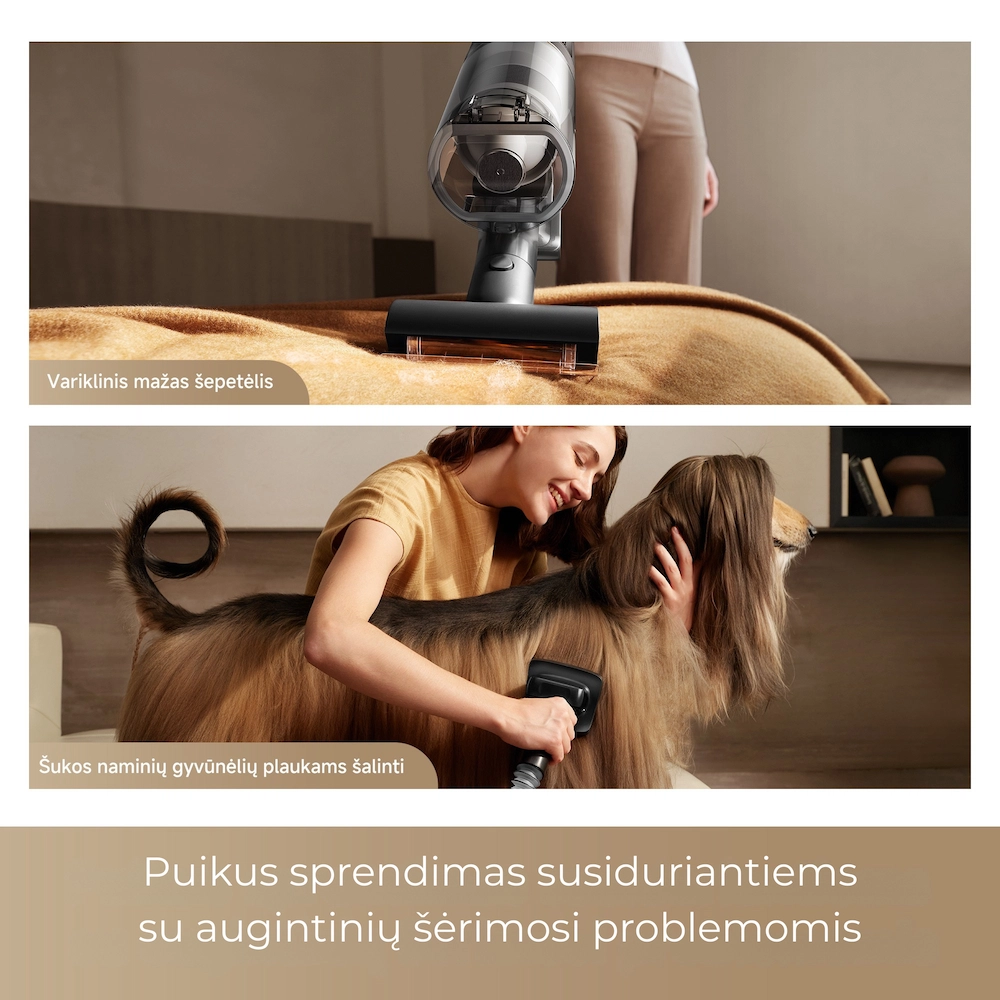 Gyvūnams skirtas šukavimo įrankis: puikiai tinka patalpoms, kuriose gyvena ilgo ir vidutinio plauko šunys bei katės. Prieš pradedant siurbti po šukavimo, pasirūpinkite, kad augintiniai būtų saugiu atstumu nuo veikiančio dulkių siurblio arba būtų pripratinti prie su siurbimu susijusių garsinių signalų.